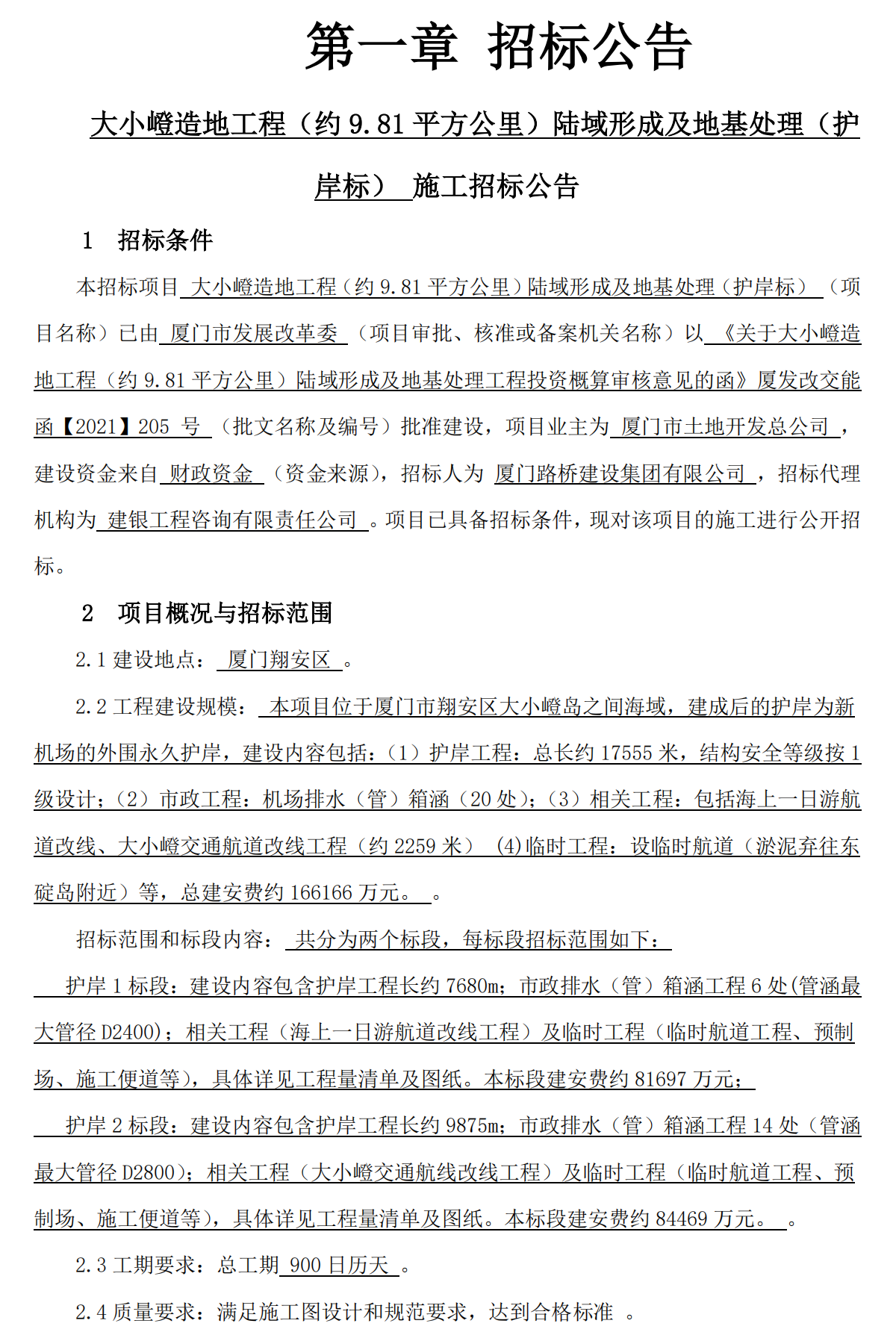 16億大項目!廈門大小嶝造地工程! 發布日期:2021年06月04日 瀏覽次數:3716 關鍵字: 公司 項目基本信息招標項目編號: E3500000717002736002招標人: 廈門路橋建設集團有限公司招標代理名稱: 建銀工程咨詢有限責任公司招標類型: 施工招標方式: 公開招標聯系電話: 13616032431
